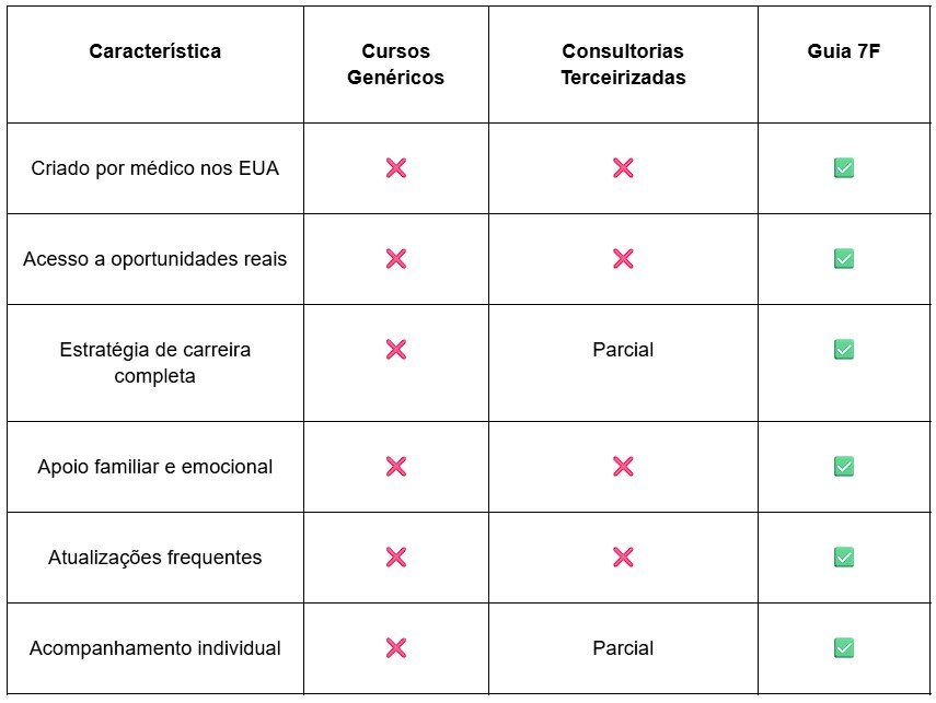 O Guia 7F inclui um diagnóstico individual para mapear exatamente quais caminhos estão abertos para você. Há médicos brasileiros atuando legalmente nos EUA em diversas especialidades — o que muda é o tempo, as exigências e os caminhos regulatórios. Você vai saber exatamente qual rota é viável para o seu perfil.